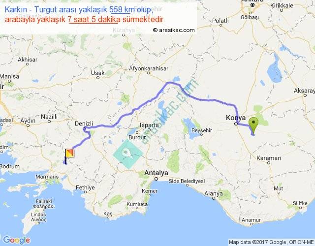 Karkın - Turgut arası yaklaşık olarak 90 km/h ile yukarıda belirtilen sürede olup, iki yerin kuş uçuşu uzaklığı (mesafesi) 372'dir. Eğer belirtilen yerler arasında uçak seferi var ise bu süre uçakla 34 dakika'ya kadar düşebilir. Yolculuk otobüsle 9 saat 12 dakika sürmektedir.
