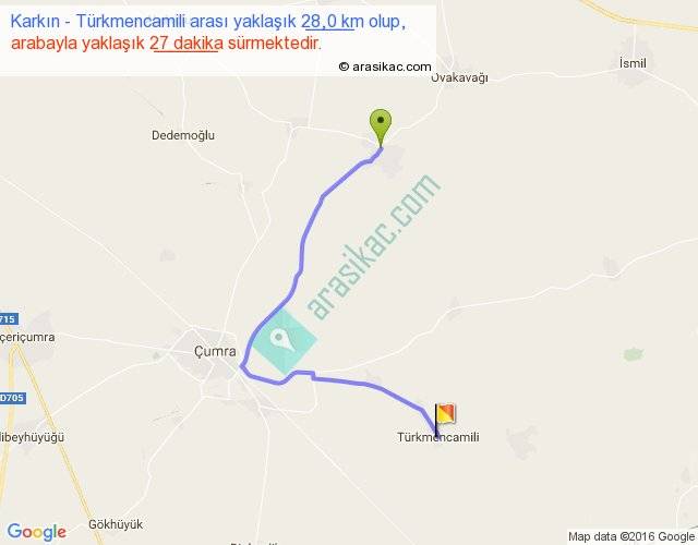 Karkın - Türkmencamili arası yaklaşık olarak 90 km/h ile yukarıda belirtilen sürede olup, iki yerin kuş uçuşu uzaklığı (mesafesi) 16'dir. Yolculuk otobüsle 35 dakika sürmektedir.
