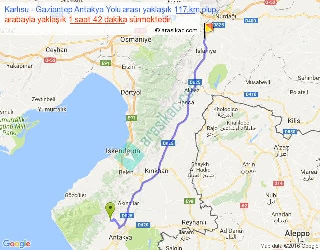 Karlısu - Gaziantep Antakya Yolu arası yaklaşık olarak 90 km/h ile yukarıda belirtilen sürede olup, iki yerin kuş uçuşu uzaklığı (mesafesi) 100'dir. Yolculuk otobüsle 2 saat 12 dakika sürmektedir.