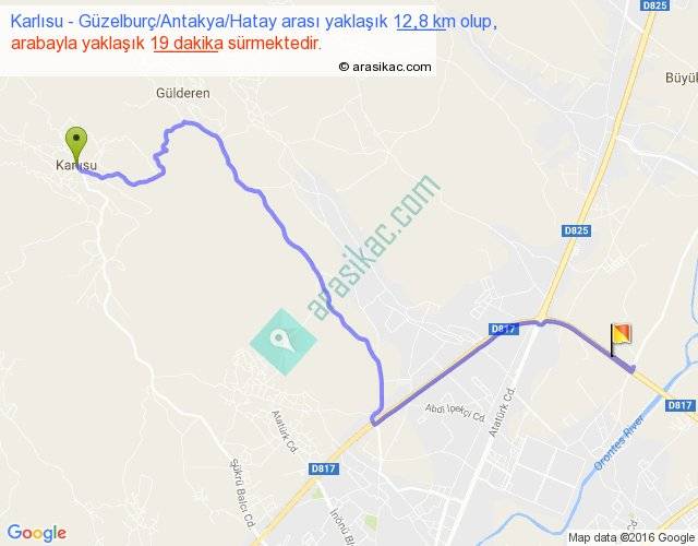 Karlısu - Güzelburç Antakya Hatay arası yaklaşık olarak 90 km/h ile yukarıda belirtilen sürede olup, iki yerin kuş uçuşu uzaklığı (mesafesi) 8'dir. Yolculuk otobüsle 24 dakika sürmektedir.