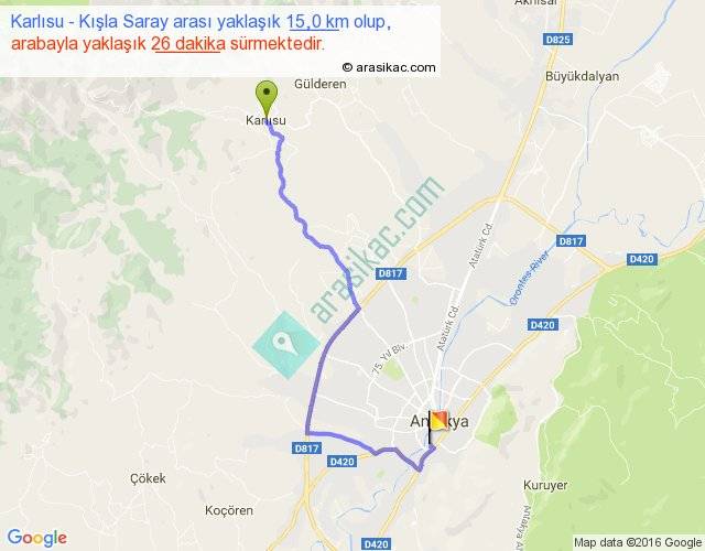 Karlısu - Kışla Saray arası yaklaşık olarak 90 km/h ile yukarıda belirtilen sürede olup, iki yerin kuş uçuşu uzaklığı (mesafesi) 10'dir. Yolculuk otobüsle 33 dakika sürmektedir.