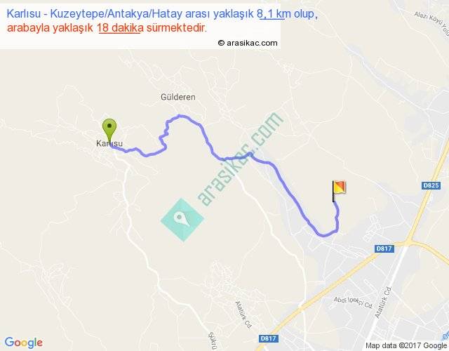 Karlısu - Kuzeytepe Antakya Hatay arası yaklaşık olarak 90 km/h ile yukarıda belirtilen sürede olup, iki yerin kuş uçuşu uzaklığı (mesafesi) 5'dir. Yolculuk otobüsle 23 dakika sürmektedir.