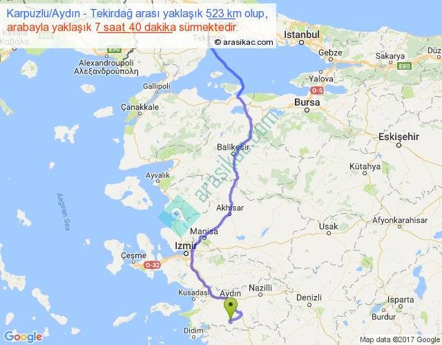 Karpuzlu Aydın - Tekirdağ arası yaklaşık olarak 90 km/h ile yukarıda belirtilen sürede olup, iki yerin kuş uçuşu uzaklığı (mesafesi) 379'dir. Eğer belirtilen yerler arasında uçak seferi var ise bu süre uçakla 34 dakika'ya kadar düşebilir. Yolculuk otobüsle 9 saat 58 dakika sürmektedir.