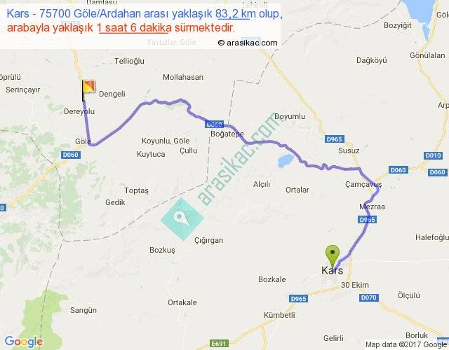 Kars - 75700 Göle Ardahan arası yaklaşık olarak 90 km/h ile yukarıda belirtilen sürede olup, iki yerin kuş uçuşu uzaklığı (mesafesi) 49'dir. Yolculuk otobüsle 1 saat 25 dakika sürmektedir.