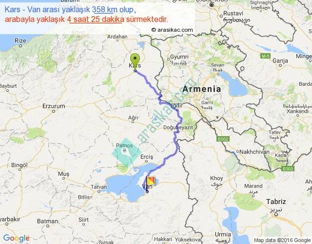 Kars - Van arası yaklaşık olarak 90 km/h ile yukarıda belirtilen sürede olup, iki yerin kuş uçuşu uzaklığı (mesafesi) 233'dir. Yolculuk otobüsle 5 saat 44 dakika sürmektedir.
