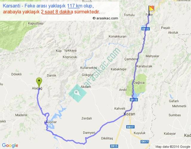 Karsanti - Feke arası yaklaşık olarak 90 km/h ile yukarıda belirtilen sürede olup, iki yerin kuş uçuşu uzaklığı (mesafesi) 53'dir. Yolculuk otobüsle 2 saat 46 dakika sürmektedir.