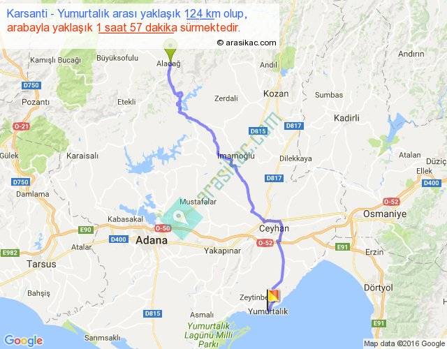 Karsanti - Yumurtalık arası yaklaşık olarak 90 km/h ile yukarıda belirtilen sürede olup, iki yerin kuş uçuşu uzaklığı (mesafesi) 92'dir. Yolculuk otobüsle 2 saat 32 dakika sürmektedir.
