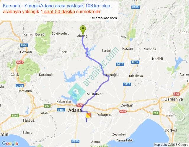 Karsanti - Yüreğir Adana arası yaklaşık olarak 90 km/h ile yukarıda belirtilen sürede olup, iki yerin kuş uçuşu uzaklığı (mesafesi) 71'dir. Yolculuk otobüsle 2 saat 23 dakika sürmektedir.