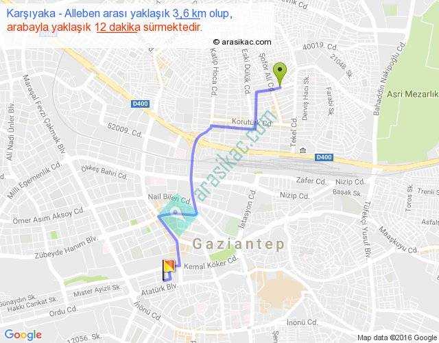 Karşıyaka - Alleben arası yaklaşık olarak 90 km/h ile yukarıda belirtilen sürede olup, iki yerin kuş uçuşu uzaklığı (mesafesi) 2'dir. Yolculuk otobüsle 15 dakika sürmektedir.