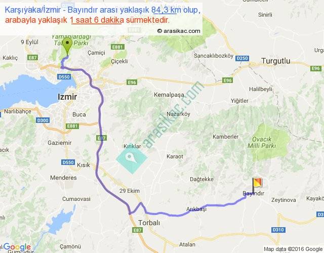 Karşıyaka İzmir - Bayındır arası yaklaşık olarak 90 km/h ile yukarıda belirtilen sürede olup, iki yerin kuş uçuşu uzaklığı (mesafesi) 54'dir. Yolculuk otobüsle 1 saat 25 dakika sürmektedir.