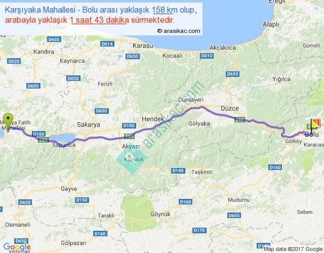 Karşıyaka Mahallesi - Bolu arası yaklaşık olarak 90 km/h ile yukarıda belirtilen sürede olup, iki yerin kuş uçuşu uzaklığı (mesafesi) 138'dir. Yolculuk otobüsle 2 saat 13 dakika sürmektedir.