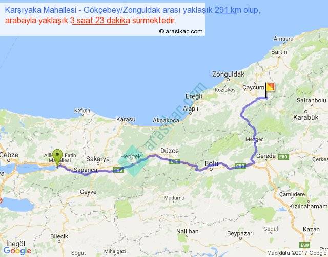 Karşıyaka Mahallesi - Gökçebey Zonguldak arası yaklaşık olarak 90 km/h ile yukarıda belirtilen sürede olup, iki yerin kuş uçuşu uzaklığı (mesafesi) 197'dir. Yolculuk otobüsle 4 saat 23 dakika sürmektedir.