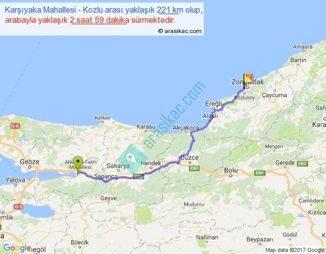 Karşıyaka Mahallesi - Kozlu arası yaklaşık olarak 90 km/h ile yukarıda belirtilen sürede olup, iki yerin kuş uçuşu uzaklığı (mesafesi) 168'dir. Yolculuk otobüsle 3 saat 52 dakika sürmektedir.