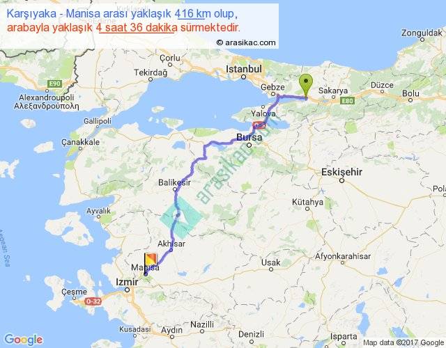 Karşıyaka - Manisa arası yaklaşık olarak 90 km/h ile yukarıda belirtilen sürede olup, iki yerin kuş uçuşu uzaklığı (mesafesi) 319'dir. Eğer belirtilen yerler arasında uçak seferi var ise bu süre uçakla 29 dakika'ya kadar düşebilir. Yolculuk otobüsle 5 saat 58 dakika sürmektedir.