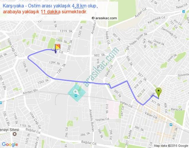 Karşıyaka - Ostim arası yaklaşık olarak 90 km/h ile yukarıda belirtilen sürede olup, iki yerin kuş uçuşu uzaklığı (mesafesi) 3'dir. Yolculuk otobüsle 14 dakika sürmektedir.