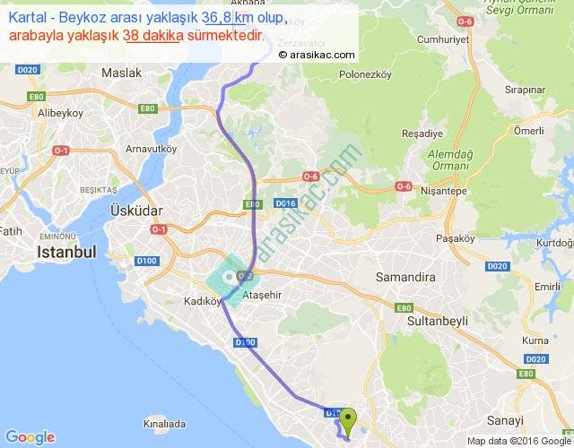 Kartal - Beykoz arası yaklaşık olarak 90 km/h ile yukarıda belirtilen sürede olup, iki yerin kuş uçuşu uzaklığı (mesafesi) 27'dir. Yolculuk otobüsle 49 dakika sürmektedir.