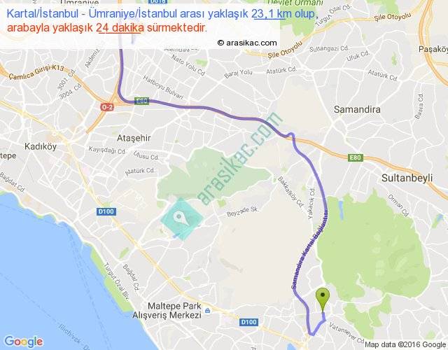 Kartal İstanbul - Ümraniye İstanbul arası yaklaşık olarak 90 km/h ile yukarıda belirtilen sürede olup, iki yerin kuş uçuşu uzaklığı (mesafesi) 13'dir. Yolculuk otobüsle 31 dakika sürmektedir.