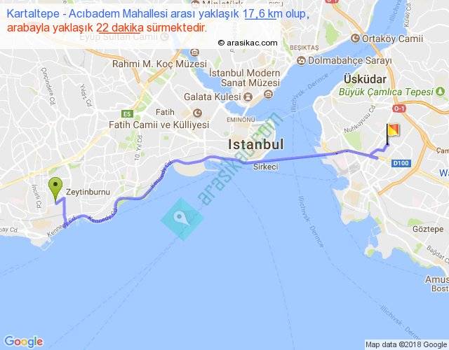 Kartaltepe - Acıbadem Mahallesi arası yaklaşık olarak 90 km/h ile yukarıda belirtilen sürede olup, iki yerin kuş uçuşu uzaklığı (mesafesi) 14'dir. Yolculuk otobüsle 28 dakika sürmektedir.