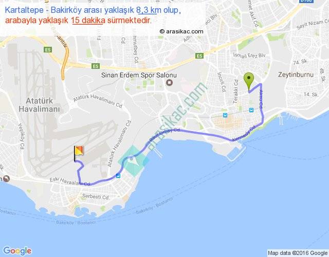 Kartaltepe - Bakirköy arası yaklaşık olarak 90 km/h ile yukarıda belirtilen sürede olup, iki yerin kuş uçuşu uzaklığı (mesafesi) 5'dir. Yolculuk otobüsle 19 dakika sürmektedir.