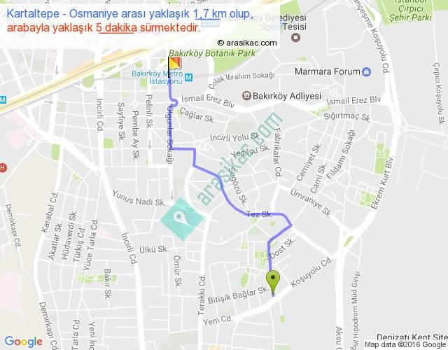 Kartaltepe - Osmaniye arası yaklaşık olarak 90 km/h ile yukarıda belirtilen sürede olup, iki yerin kuş uçuşu uzaklığı (mesafesi) 1'dir. Yolculuk otobüsle 6 dakika sürmektedir.