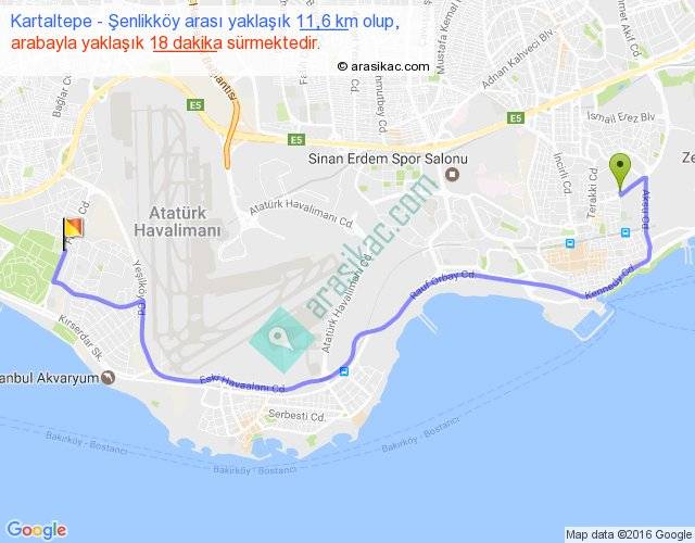 Kartaltepe - Şenlikköy arası yaklaşık olarak 90 km/h ile yukarıda belirtilen sürede olup, iki yerin kuş uçuşu uzaklığı (mesafesi) 7'dir. Yolculuk otobüsle 23 dakika sürmektedir.