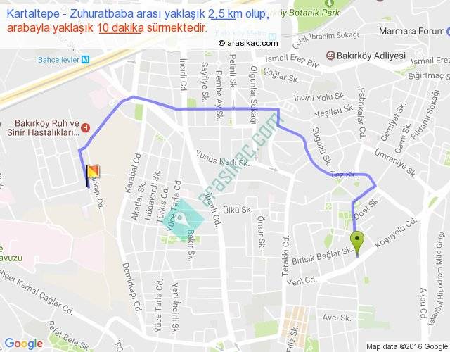 Kartaltepe - Zuhuratbaba arası yaklaşık olarak 90 km/h ile yukarıda belirtilen sürede olup, iki yerin kuş uçuşu uzaklığı (mesafesi) 1'dir. Yolculuk otobüsle 13 dakika sürmektedir.
