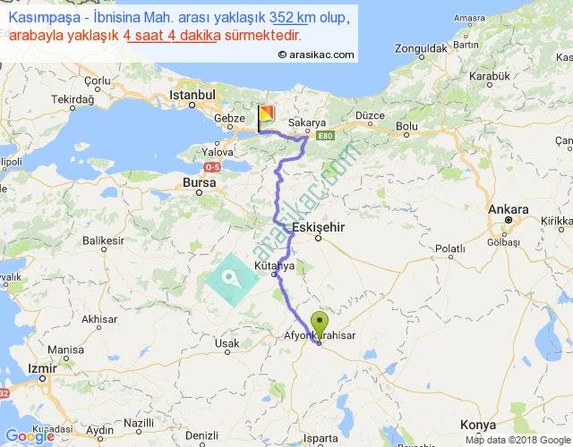 Kasımpaşa - İbnisina Mah. arası yaklaşık olarak 90 km/h ile yukarıda belirtilen sürede olup, iki yerin kuş uçuşu uzaklığı (mesafesi) 229'dir. Yolculuk otobüsle 5 saat 17 dakika sürmektedir.