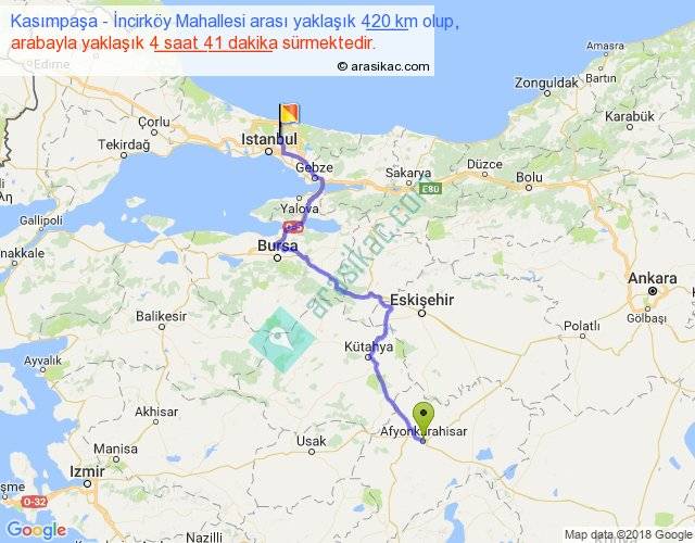 Kasımpaşa - İncirköy Mahallesi arası yaklaşık olarak 90 km/h ile yukarıda belirtilen sürede olup, iki yerin kuş uçuşu uzaklığı (mesafesi) 287'dir. Eğer belirtilen yerler arasında uçak seferi var ise bu süre uçakla 26 dakika'ya kadar düşebilir. Yolculuk otobüsle 6 saat 5 dakika sürmektedir.
