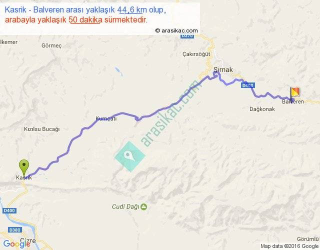Kasrik - Balveren arası yaklaşık olarak 90 km/h ile yukarıda belirtilen sürede olup, iki yerin kuş uçuşu uzaklığı (mesafesi) 33'dir. Yolculuk otobüsle 1 saat 5 dakika sürmektedir.