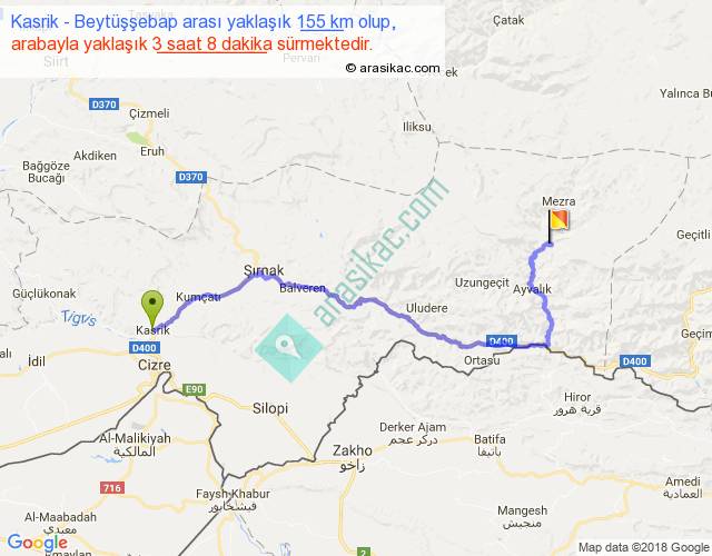 Kasrik - Beytüşşebap arası yaklaşık olarak 90 km/h ile yukarıda belirtilen sürede olup, iki yerin kuş uçuşu uzaklığı (mesafesi) 88'dir. Yolculuk otobüsle 4 saat 4 dakika sürmektedir.