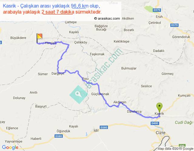 Kasrik - Çalışkan arası yaklaşık olarak 90 km/h ile yukarıda belirtilen sürede olup, iki yerin kuş uçuşu uzaklığı (mesafesi) 56'dir. Yolculuk otobüsle 2 saat 45 dakika sürmektedir.
