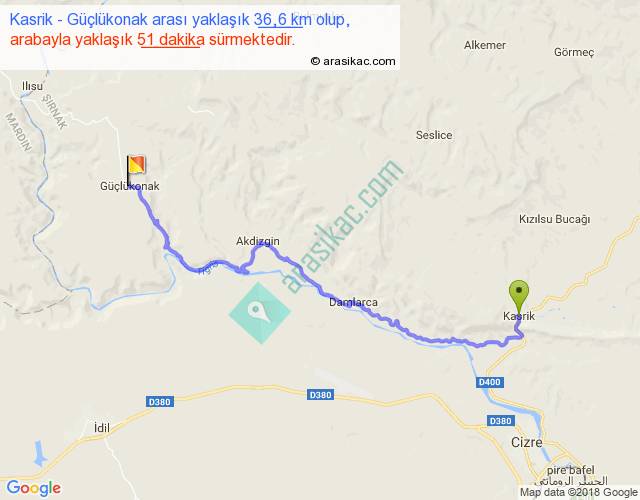 Kasrik - Güçlükonak arası yaklaşık olarak 90 km/h ile yukarıda belirtilen sürede olup, iki yerin kuş uçuşu uzaklığı (mesafesi) 25'dir. Yolculuk otobüsle 1 saat 6 dakika sürmektedir.