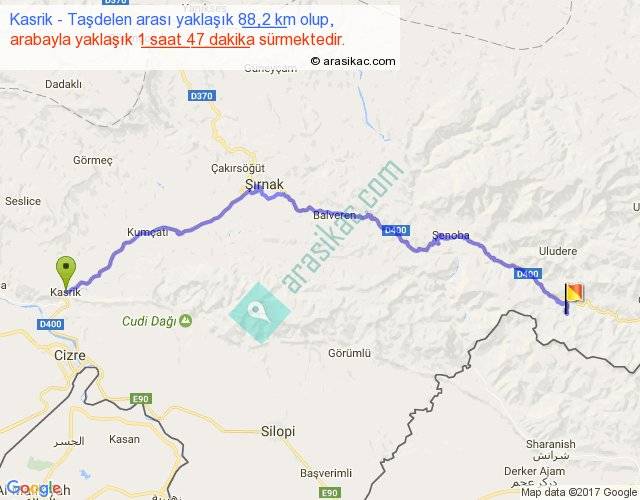 Kasrik - Taşdelen arası yaklaşık olarak 90 km/h ile yukarıda belirtilen sürede olup, iki yerin kuş uçuşu uzaklığı (mesafesi) 60'dir. Yolculuk otobüsle 2 saat 19 dakika sürmektedir.