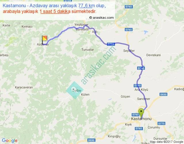 Kastamonu - Azdavay arası yaklaşık olarak 90 km/h ile yukarıda belirtilen sürede olup, iki yerin kuş uçuşu uzaklığı (mesafesi) 49'dir. Yolculuk otobüsle 1 saat 24 dakika sürmektedir.
