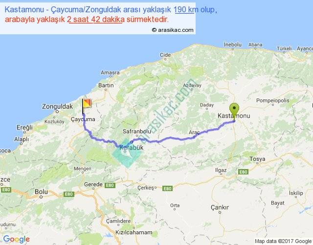 Kastamonu - Çaycuma Zonguldak arası yaklaşık olarak 90 km/h ile yukarıda belirtilen sürede olup, iki yerin kuş uçuşu uzaklığı (mesafesi) 141'dir. Yolculuk otobüsle 3 saat 30 dakika sürmektedir.