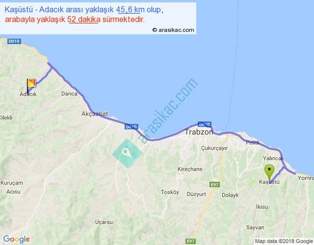 Kaşüstü - Adacık arası yaklaşık olarak 90 km/h ile yukarıda belirtilen sürede olup, iki yerin kuş uçuşu uzaklığı (mesafesi) 30'dir. Yolculuk otobüsle 1 saat 7 dakika sürmektedir.
