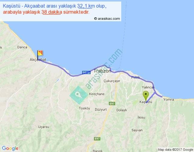 Kaşüstü - Akçaabat arası yaklaşık olarak 90 km/h ile yukarıda belirtilen sürede olup, iki yerin kuş uçuşu uzaklığı (mesafesi) 22'dir. Yolculuk otobüsle 49 dakika sürmektedir.
