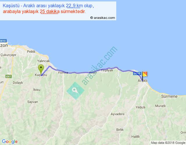 Kaşüstü - Araklı arası yaklaşık olarak 90 km/h ile yukarıda belirtilen sürede olup, iki yerin kuş uçuşu uzaklığı (mesafesi) 20'dir. Yolculuk otobüsle 32 dakika sürmektedir.