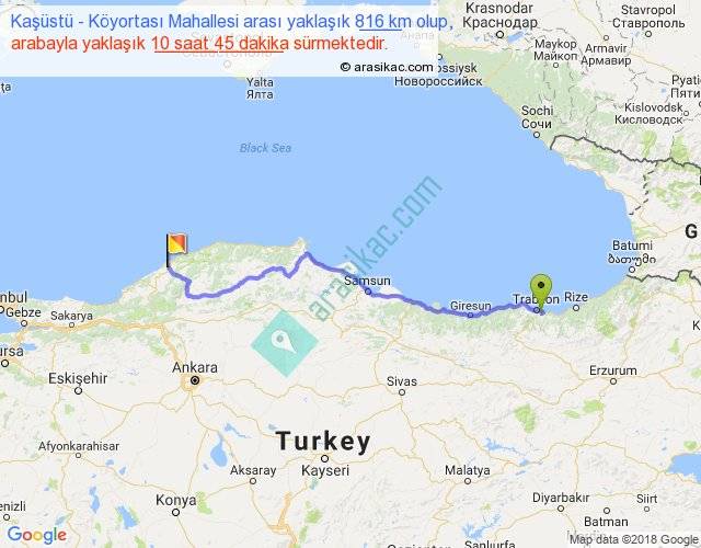Kaşüstü - Köyortası Mahallesi arası yaklaşık olarak 90 km/h ile yukarıda belirtilen sürede olup, iki yerin kuş uçuşu uzaklığı (mesafesi) 626'dir. Eğer belirtilen yerler arasında uçak seferi var ise bu süre uçakla 57 dakika'ya kadar düşebilir. Yolculuk otobüsle 13 saat 58 dakika sürmektedir.