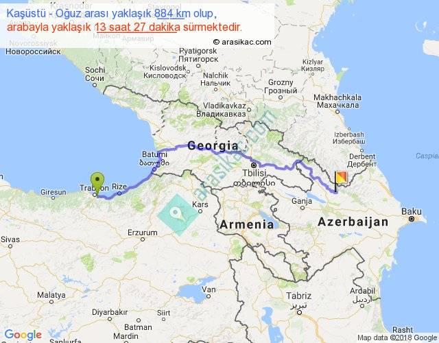 Kaşüstü - Oğuz arası yaklaşık olarak 90 km/h ile yukarıda belirtilen sürede olup, iki yerin kuş uçuşu uzaklığı (mesafesi) 638'dir. Eğer belirtilen yerler arasında uçak seferi var ise bu süre uçakla 58 dakika'ya kadar düşebilir. Yolculuk otobüsle 17 saat 29 dakika sürmektedir.