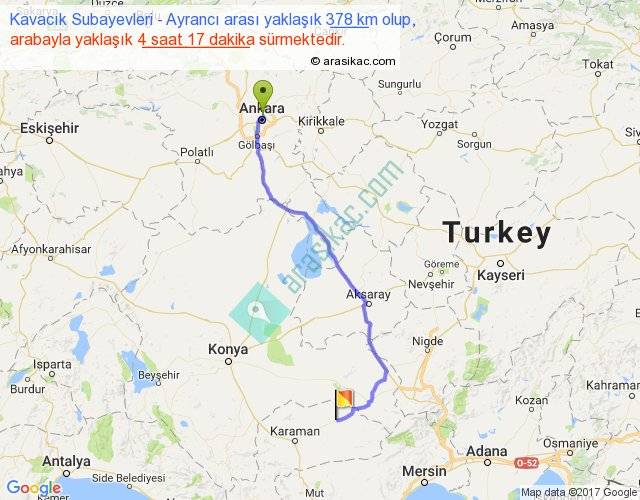 Kavacık Subayevleri - Ayrancı arası yaklaşık olarak 90 km/h ile yukarıda belirtilen sürede olup, iki yerin kuş uçuşu uzaklığı (mesafesi) 297'dir. Eğer belirtilen yerler arasında uçak seferi var ise bu süre uçakla 27 dakika'ya kadar düşebilir. Yolculuk otobüsle 5 saat 34 dakika sürmektedir.