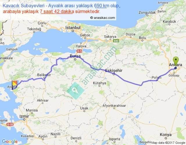 Kavacık Subayevleri - Ayvalık arası yaklaşık olarak 90 km/h ile yukarıda belirtilen sürede olup, iki yerin kuş uçuşu uzaklığı (mesafesi) 531'dir. Eğer belirtilen yerler arasında uçak seferi var ise bu süre uçakla 49 dakika'ya kadar düşebilir. Yolculuk otobüsle 10 saat 0 dakika sürmektedir.