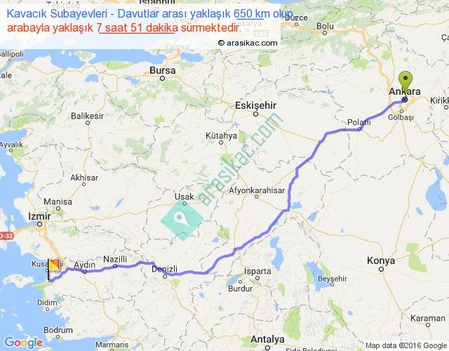 Kavacık Subayevleri - Davutlar arası yaklaşık olarak 90 km/h ile yukarıda belirtilen sürede olup, iki yerin kuş uçuşu uzaklığı (mesafesi) 540'dir. Eğer belirtilen yerler arasında uçak seferi var ise bu süre uçakla 49 dakika'ya kadar düşebilir. Yolculuk otobüsle 10 saat 12 dakika sürmektedir.