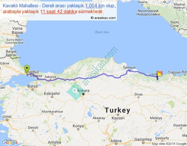 Kavaklı Mahallesi - Dereli arası yaklaşık olarak 90 km/h ile yukarıda belirtilen sürede olup, iki yerin kuş uçuşu uzaklığı (mesafesi) 821'dir. Eğer belirtilen yerler arasında uçak seferi var ise bu süre uçakla 1 saat 15 dakika'ya kadar düşebilir. Yolculuk otobüsle 15 saat 12 dakika sürmektedir.