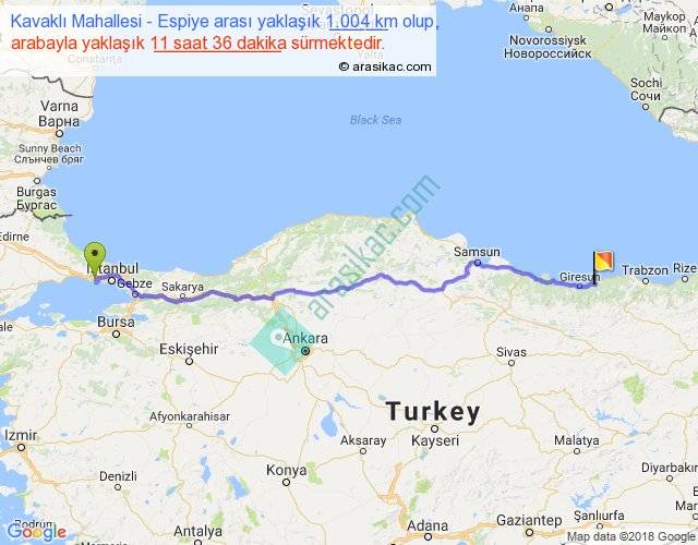 Kavaklı Mahallesi - Espiye arası yaklaşık olarak 90 km/h ile yukarıda belirtilen sürede olup, iki yerin kuş uçuşu uzaklığı (mesafesi) 840'dir. Eğer belirtilen yerler arasında uçak seferi var ise bu süre uçakla 1 saat 17 dakika'ya kadar düşebilir. Yolculuk otobüsle 15 saat 4 dakika sürmektedir.