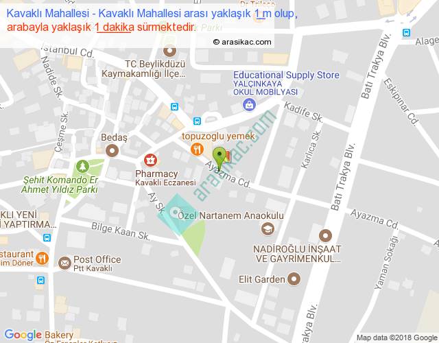 Kavaklı Mahallesi - Kavaklı Mahallesi arası yaklaşık olarak 90 km/h ile yukarıda belirtilen sürede olup, iki yerin kuş uçuşu uzaklığı (mesafesi) 0'dir. Yolculuk otobüsle 1 dakika sürmektedir.