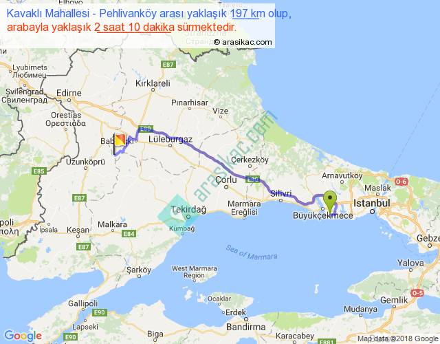 Kavaklı Mahallesi - Pehlivanköy arası yaklaşık olarak 90 km/h ile yukarıda belirtilen sürede olup, iki yerin kuş uçuşu uzaklığı (mesafesi) 148'dir. Yolculuk otobüsle 2 saat 49 dakika sürmektedir.