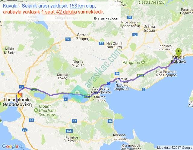 Kavala - Selanik arası yaklaşık olarak 90 km/h ile yukarıda belirtilen sürede olup, iki yerin kuş uçuşu uzaklığı (mesafesi) 127'dir. Yolculuk otobüsle 2 saat 12 dakika sürmektedir.