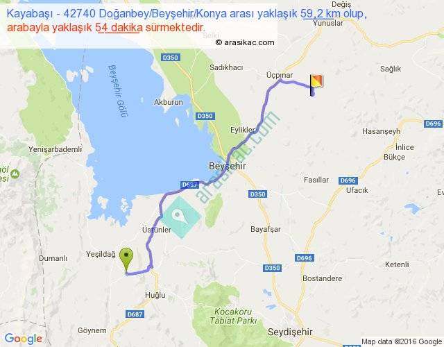 Kayabaşı - 42740 Doğanbey Beyşehir Konya arası yaklaşık olarak 90 km/h ile yukarıda belirtilen sürede olup, iki yerin kuş uçuşu uzaklığı (mesafesi) 44'dir. Yolculuk otobüsle 1 saat 10 dakika sürmektedir.