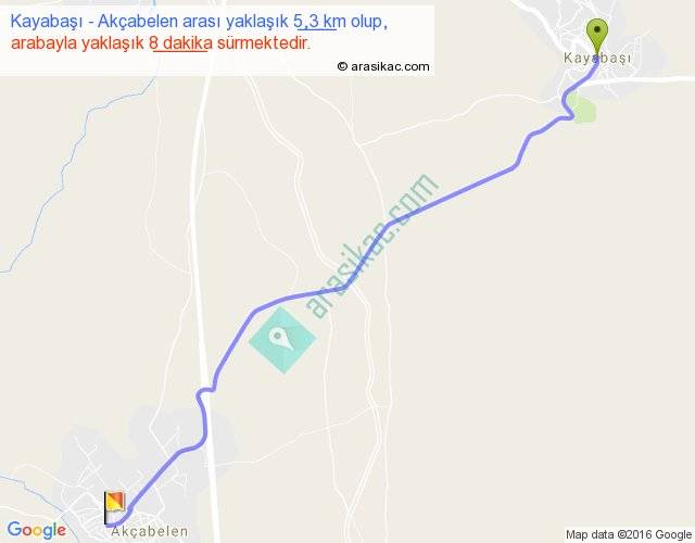 Kayabaşı - Akçabelen arası yaklaşık olarak 90 km/h ile yukarıda belirtilen sürede olup, iki yerin kuş uçuşu uzaklığı (mesafesi) 5'dir. Yolculuk otobüsle 10 dakika sürmektedir.